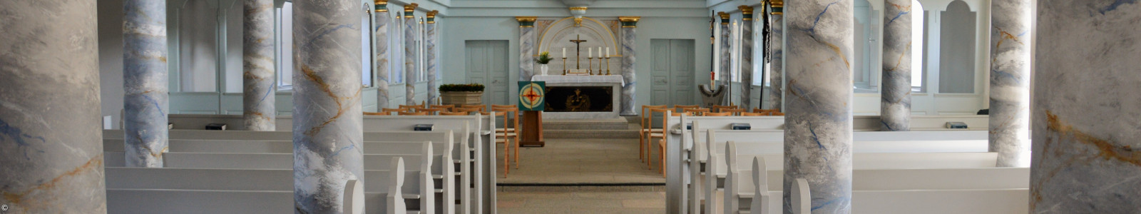 Freundlich, sympathisch und einladend zeigt sich unsere Kirche nach der umfassenden Sanierung zu Beginn der "0-er" Jahre. Der helle lichte Innenraum - konzipiert als Saalbau - mit seinen Prinzipalstücken Kanzelaltar und Taufstein wirkt - im klassizistischen Stil gehalten - leicht und trotzdem konzentriert. Der Prospekt unserer zweimanualigen Heidenreich-Orgel fügt sich harmonisch mit in das Gesamtbild ein.